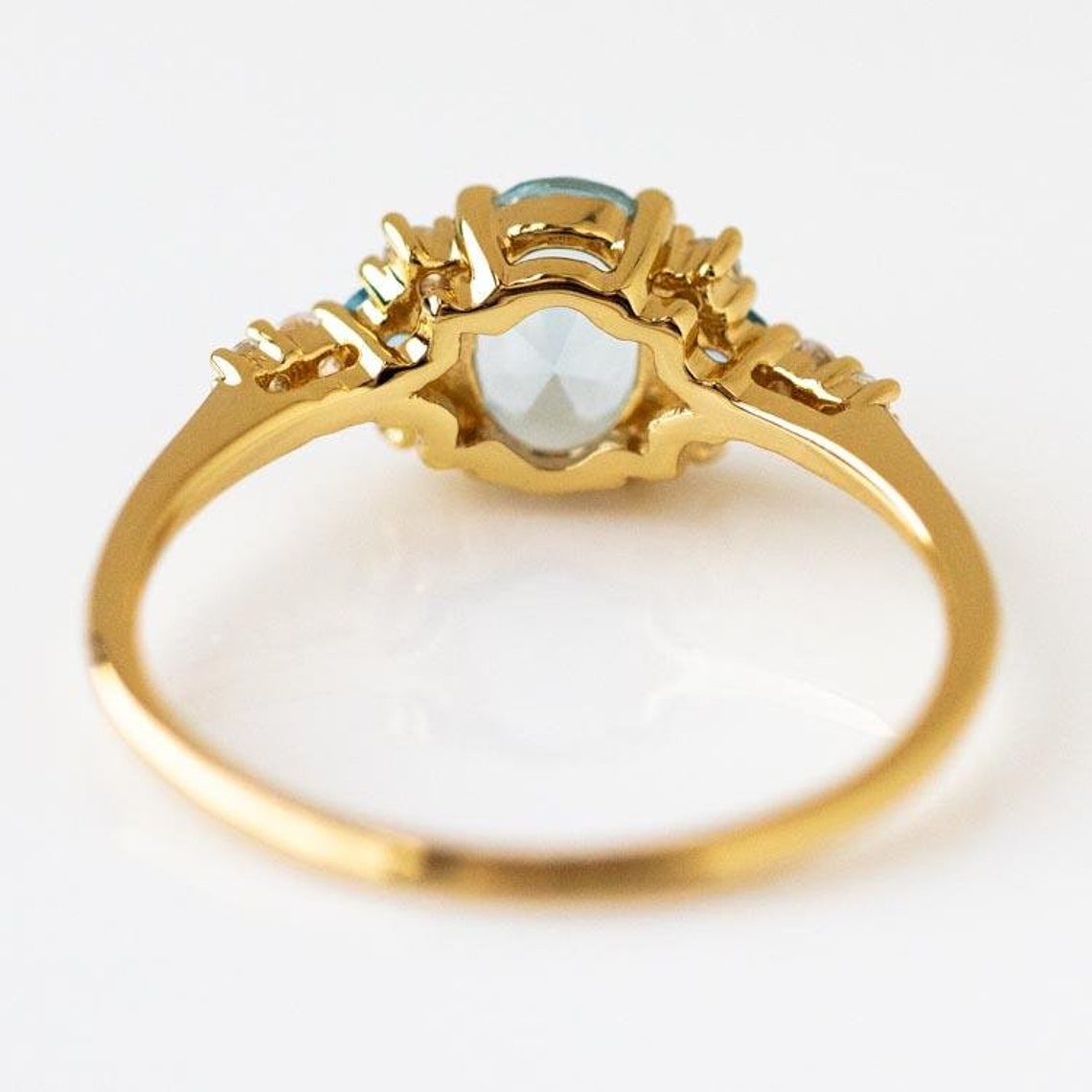 - Round Brilliant Cut: The diamonds adorning this ring expertly cut into the timeless round brilliant shape. Renowned for its unparalleled fire and brilliance. Their exquisite sparkle complements the lustrous blue topaz, creating a harmonious symphony of light and color.