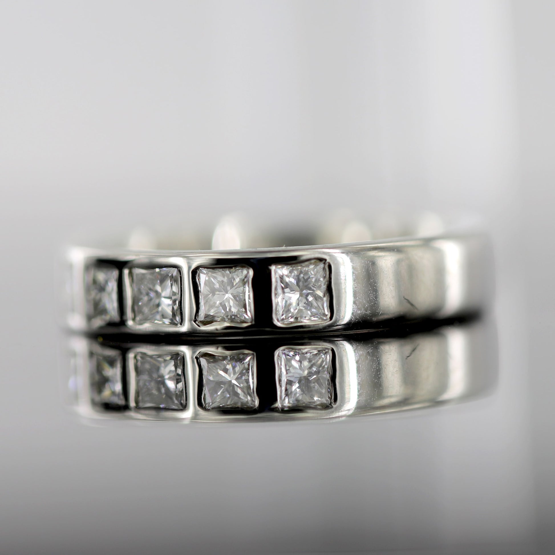 Check out our princess diamond band. Which is one of a kind diamond white gold wedding band that will fit your vibe.